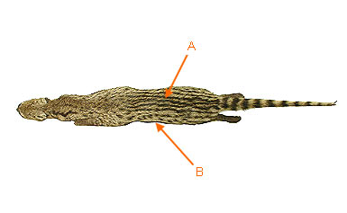 There are 3 species known in Tanzania: Genetta genetta, Genetta servalina and Genetta tigrina. The genets are recognized by the ringed long tail and spots in rows on the side of the animal. There is only one longitudinal stripe along the back of the animal.